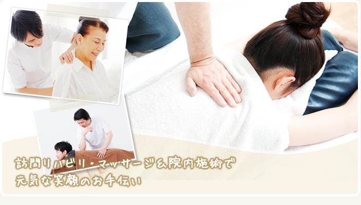 院内および通院が困難な方でも、在宅にて訪問リハビリ・マッサージ、はり・灸・運動療法による施術を受けることができます。